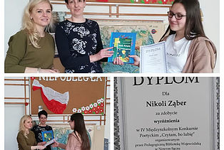 Serdecznie gratulujemy naszej uczennicy Nikoli Ząber zdobycia wyróżnienia w IV Międzyszkolnym Konkursie Poetyckim "Czytam bo lubię" organizowanym przez Pedagogiczną  Bibliotekę Wojewódzką  w Nowym Sączu. Czytanie to jedna z pasji naszej uczennicy, dzięki, której może rozwijać się również w innych dziedzinach. Śmiało może powiedzieć, że "Czytam bo lubię".